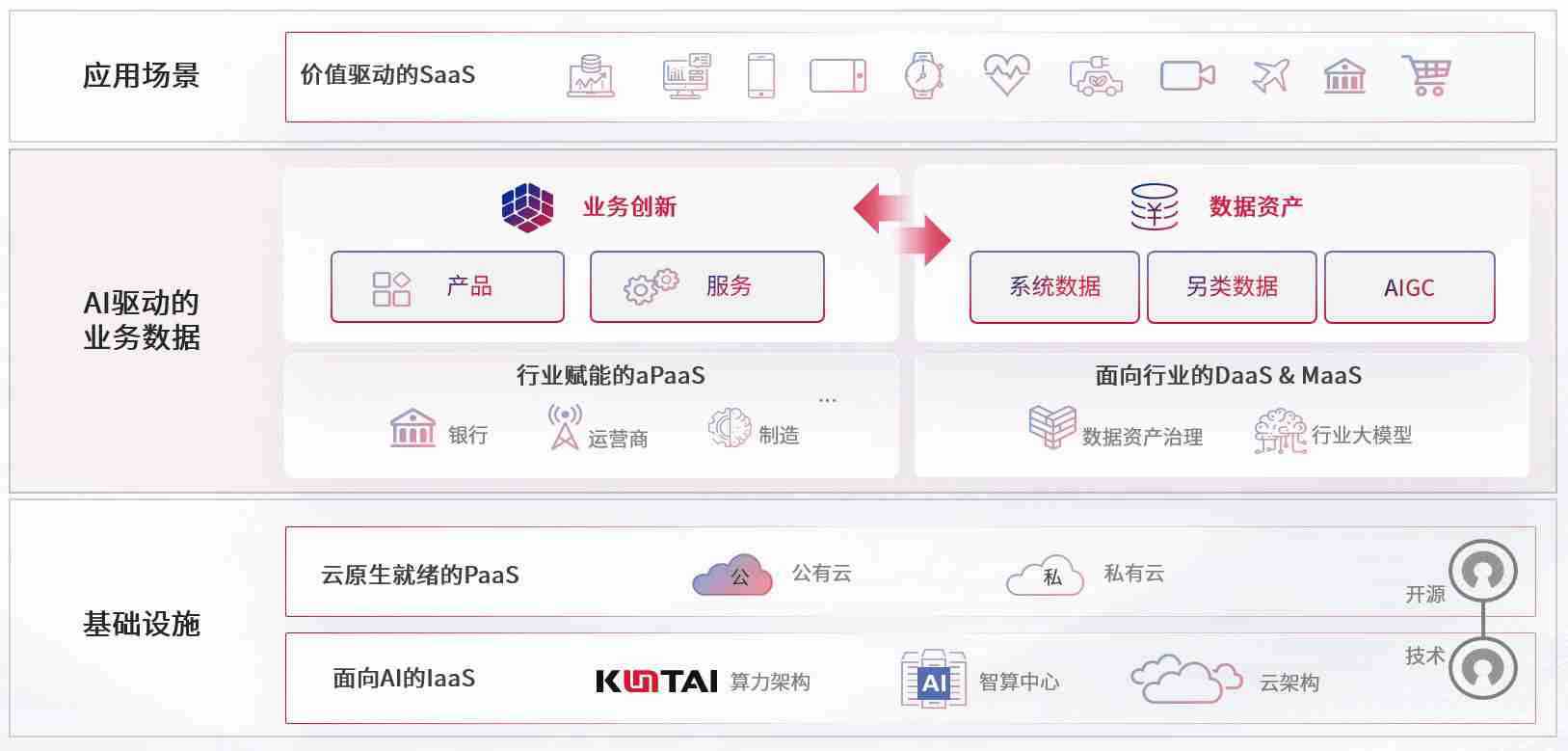 数字时代,,围绕企业数字化转型的关键要素,,AG尊龙凯时数码开创性的提出数云融合战略和技术体系框架,,着力在云原生、、数字原生、、AI原生和信创产业上架构产品和服务能力,,,为处在不同数字化转型阶段的快消零售、、汽车、、、、金融、、医疗、、政企、、、、教育、、、、运营商等行业客户提供泛在的敏捷IT能力和融合的数据驱动能力,,,,构建跨界融合创新的数字业务场景和新业务模式,,助力企业级客户建立面向未来的核心能力和竞争优势,,,全面推动社会的数字化、、、智能化转型升级。。