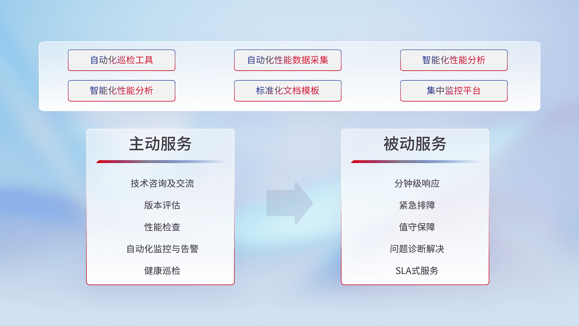 智能化工具和标准化文档,,保障服务质量,,,,提供主动服务(包含技术咨询、、、、版本评估、、性能检查、、、、自动化监控与告警、、、、健康巡检)和被动服务包含(分钟级响应、、、、紧急排障、、、、值守保障、、、、问题诊断解决、、、、SLA服务)。。。